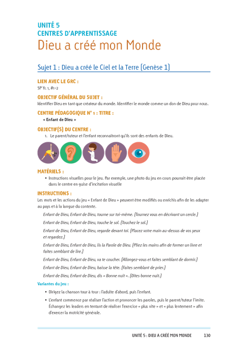 Ce document fait partie du curriculum supplémentaire pour les 3-5 ans, un ensemble de ressources conçu pour accompagner le curriculum des ressources globales (GRC) de Compassion International pour les parents/tuteurs et les enfants âgés de 3 à 5 ans, grâce à un programme d'études intégré adapté à leur âge et à leur degré de développement. Unité 5 : Dieu nous a donné des Communautés, contient des leçons sur les sujets suivants : « Ceci est ma Communauté » et « J'explore ma communauté ».